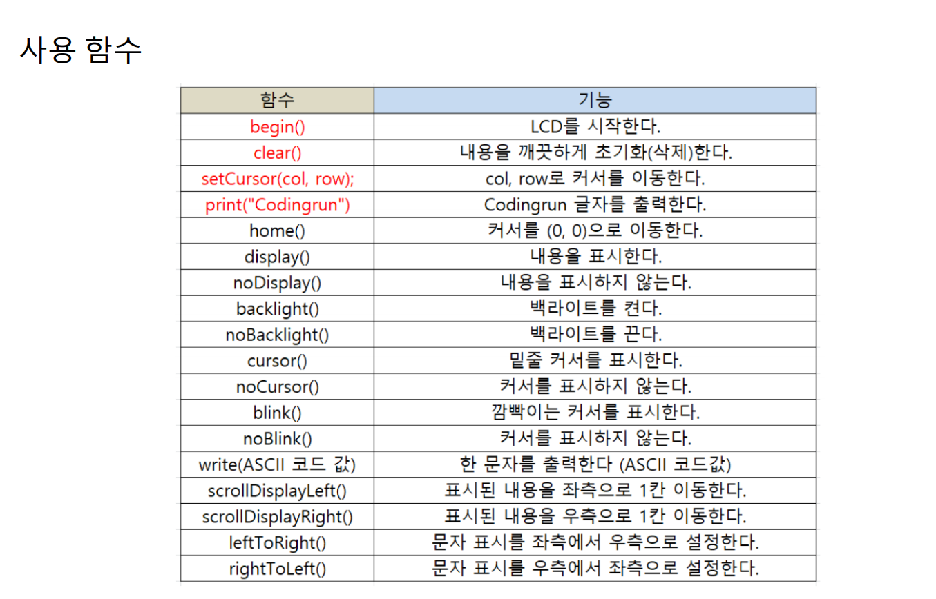 LCD를 활용하여 다양한 표현이 가능하고 센서의 값을 읽어서 화면에 표시하는 등 활용도는 무궁무진 합니다.
