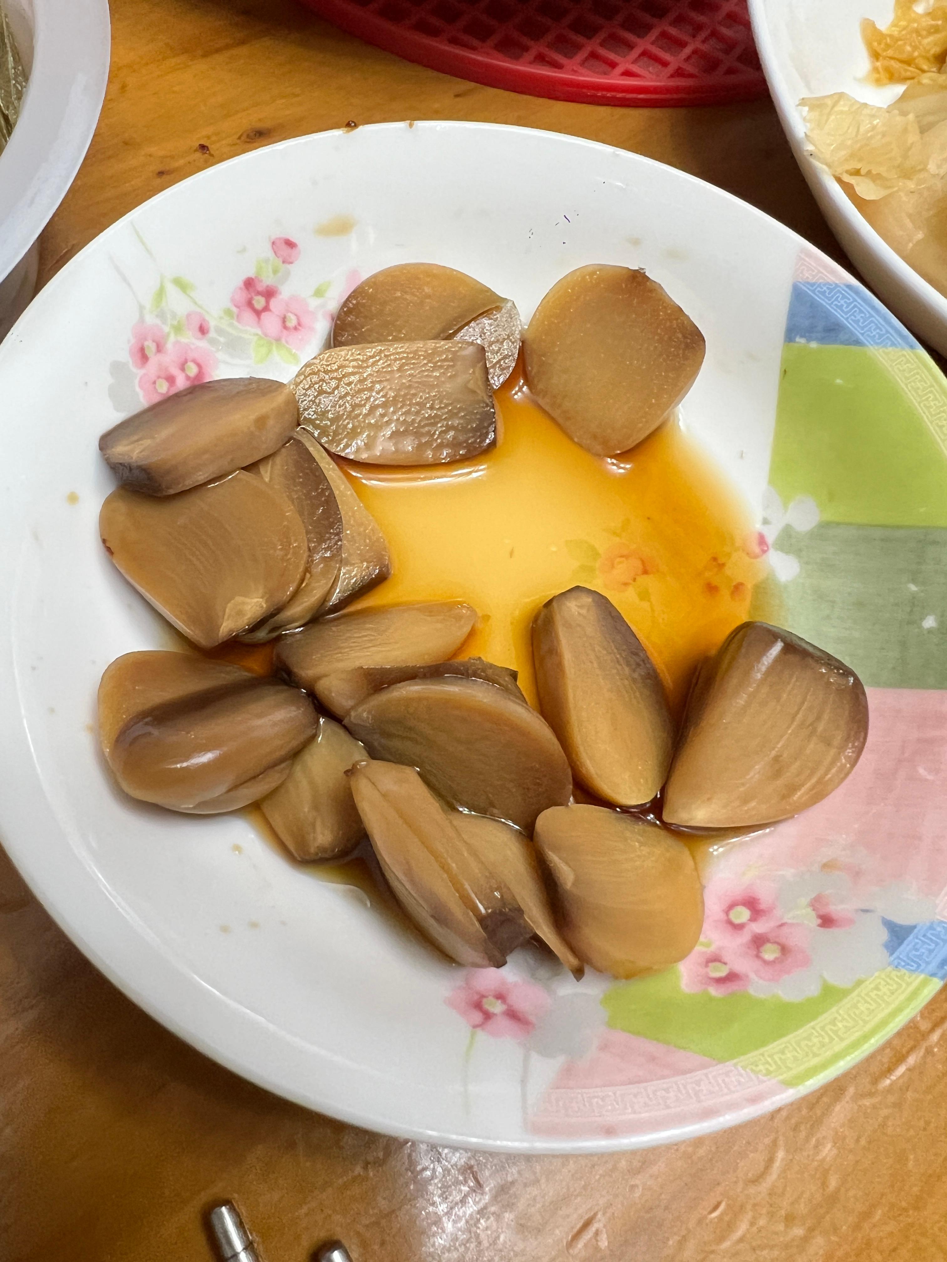 한국인의 밥상에 빠질 수 없죠? 마늘 장아찌 입니다. 느끼함을 딱 잡아주니 훨씬 먹기 편해집니다.