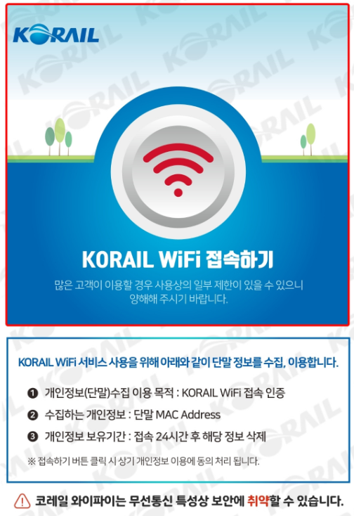 코레일 와이파이를 선택하면 아래와 같은 화면을 웹 브라우저에서 볼 수 있습니다. 제가 사용을 해보니 연결은 잘 됩니다. 다만 노트북의 경우에 인터넷을 사용하지 않으면 끊어지는 경우가 있습니다. 이때는 다시 접속하기를 하면 다시 원활하게 접속이 됩니다. 스마트폰의 경우에는 스트리밍 영상을 보거나 음악을 들으면 끊어지지 않고 사용이 가능합니다. 아마도 쉬는 시간에 인터넷 접속이 끊어지도록 세팅이 된것 같습니다.